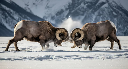 Two bighorn sheep fight in snowy landscape with mountains in background