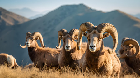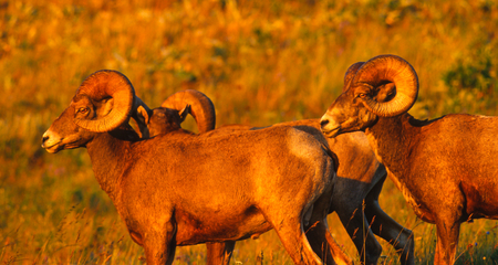 Close-up of three bighorn sheep rams on a high grassy open ridge with the setting sun lighting them up like christmas trees. Colors of the rams are vibrant and saturated, in particular the colors of the eyes and horns are very dazzling and luminous.