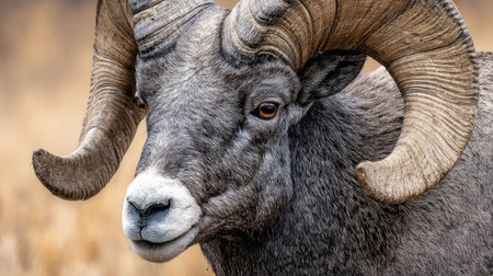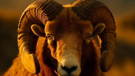 Close-up portrait of a majestic ram showcasing its impressive curved horns and striking features against a dark background, representing wildlife's beauty and strength.