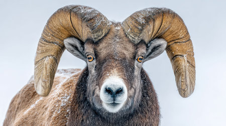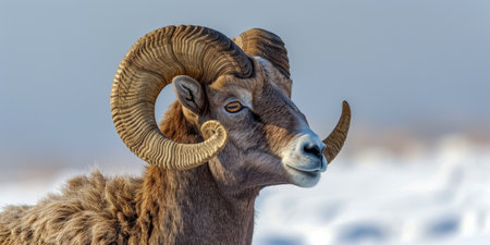 Majestic Bighorn Sheep in Snowy Landscape, Close-Up Portrait.