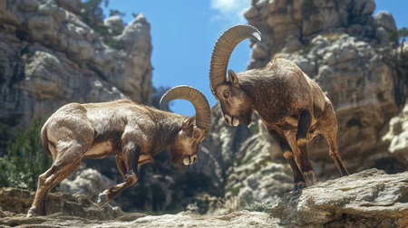 A pair of male Iberian ibex sparring on a rocky slope in the Sierra de Gredos, with their powerful horns locked in a playful duel.