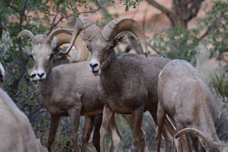 Summer capture of desert bighorn sheep rams and ewes, standing in some shaded habitat at Zion National Park, southwest Utah.
