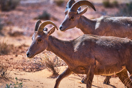 The wild goats walk in the desert in the Valley of Fire, Nevada, USA. High quality photo
