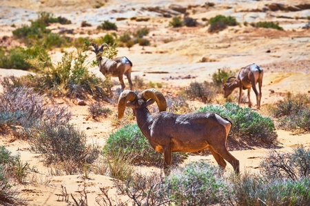 Bighorn Sheep Grazing Among Desert Shrubs in Sunlit Valley of Fire Nevada