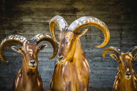 Group of barbary sheep wild goats antelope lying resting in sand ground on hot summer day. Herd of wild Texas aoudad goats with large curvy horns outdoor in savanna park.