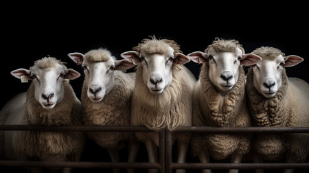 White sheep standing together in a lush green field gazing at the camera, ai-generated