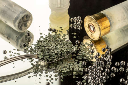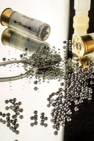 Hunting equipment. Shotgun shells hunting cartridges with gunpowder and many plumbeous fractions lead shot on wooden table background, close-up