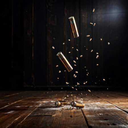 Close-up of ammo and shotgun on wood floor with selective focus.