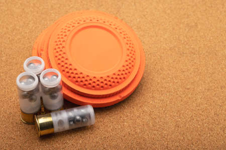 Clay disc flying targets and shotgun bullets on texture background ,Clay Pigeon target game