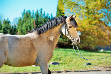 A young horse of the breed Welsh pony of a dun color runs beautifully at a trot in a levada in freedom in the snow