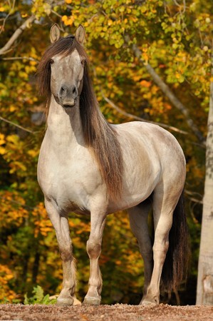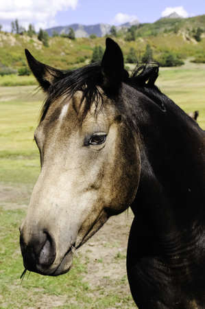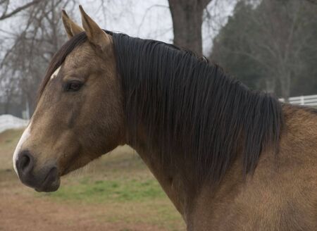 A close up of a Norwegian Fjord horse, brown dun coated.
