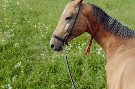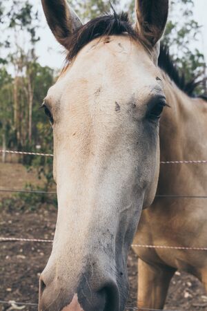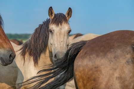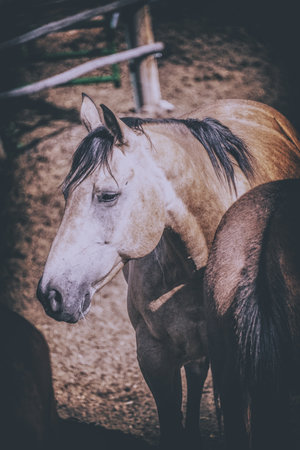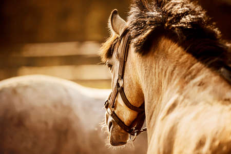 Portrait of a playful, beautiful horse of a palomino race, which gently laid its head on the croup of another horse on a sunny summer day.