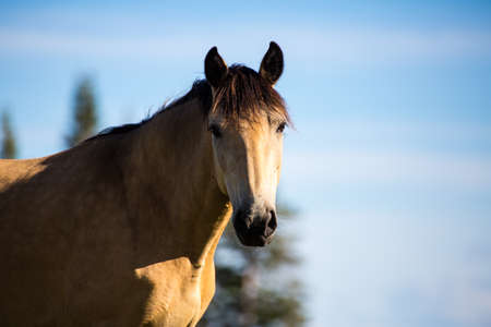 Close up portrait of a brown horse with blonde mane illuminated by warm glow of setting sun.