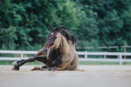 Brown horse running fast on sandy desert with dust flying, powerful animal in motion under clear sky, wild energy and freedom