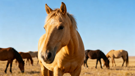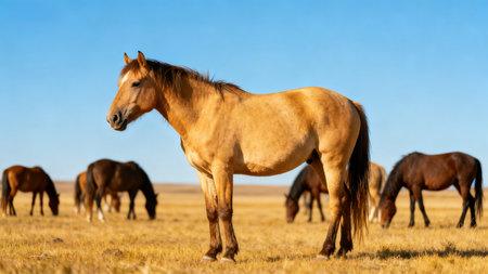 A group of elegant horses gallops swiftly through a vast, golden field at sunset. Their manes flutter in the wind as they create a cloud of dust, embodying freedom and beauty.