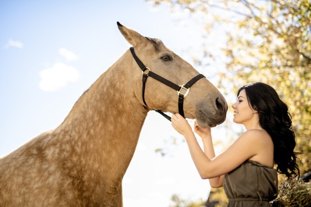 Young happy woman with her pony horse in evening sunset light. Outdoor photography with fashion model girl. Lifestyle mood. Concept of outdoor riding, sports and recreation.