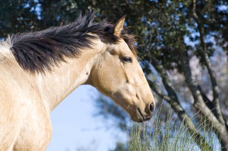 portrait of sandy young Andalusian stallion posing near greens wall. Andalusia, Spain. close up
