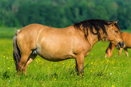 A beautiful Belarusian draft horse is grazing on a summer field.