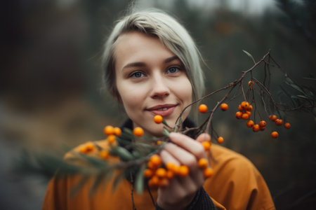 Young woman holding a sea buckthorn in her hand, with a blissful expression on her face