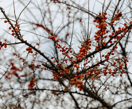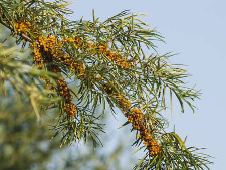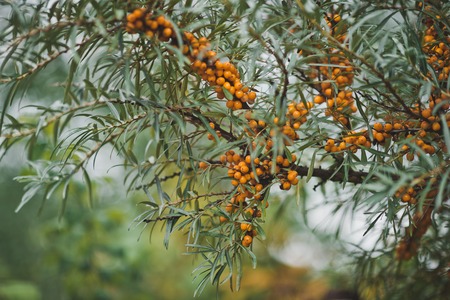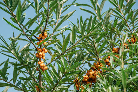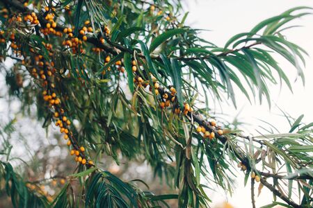 Sea buckthorn growing on a tree close-up Hippophae rhamnoides . Medical plant. Selective focus