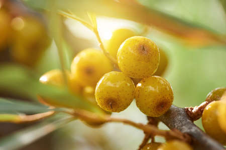 Shiny yellow sea buckthorn illuminated by the solar rays on a branch.