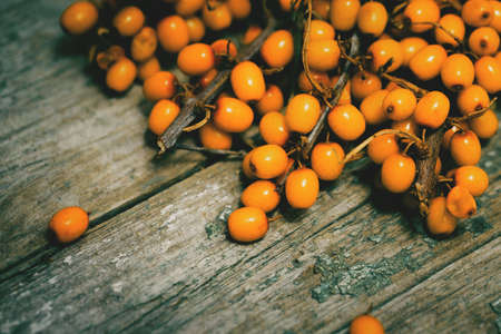 Sea buckthorn. Fresh ripe berries on wooden table. Healthy diet concept. Food suitable for vegan and vegetarians. Top view