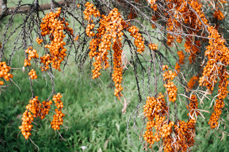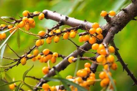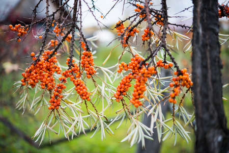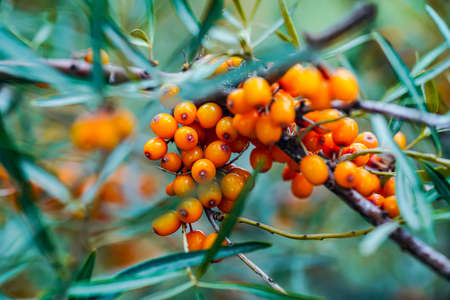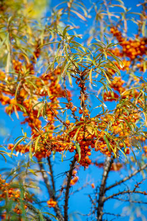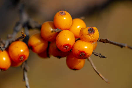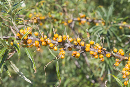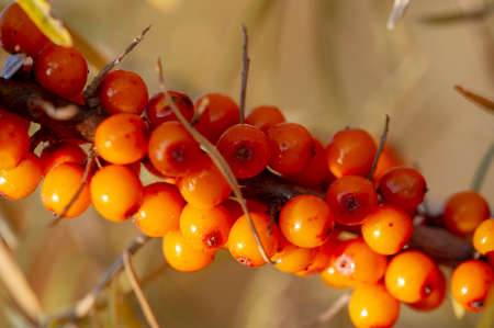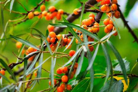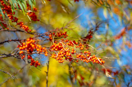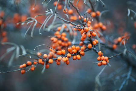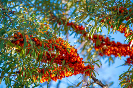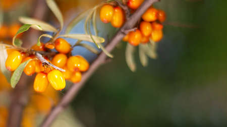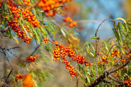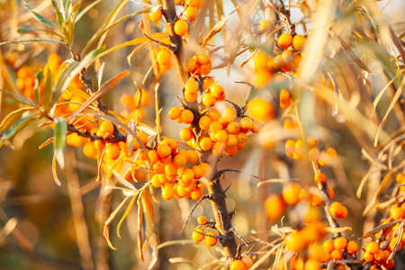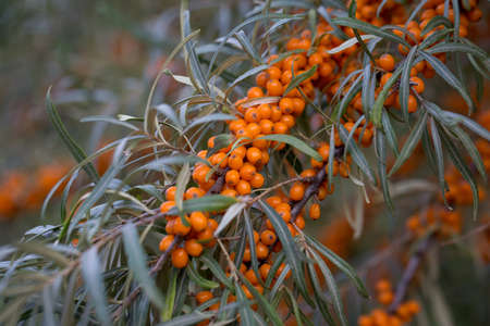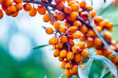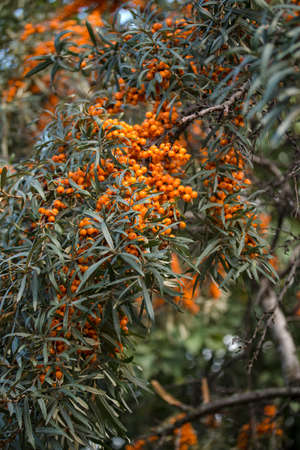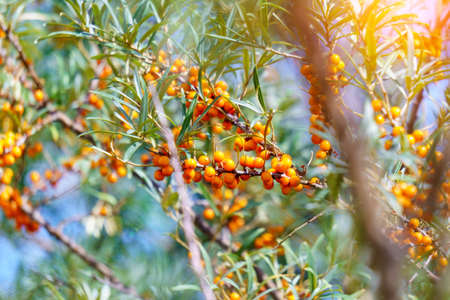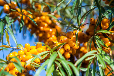 Outdoor sea buckthorn berries, ripe in autumn