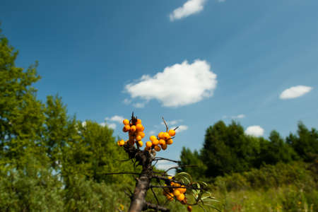 Ripe wild berries sea buckthorn in forest.