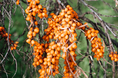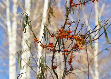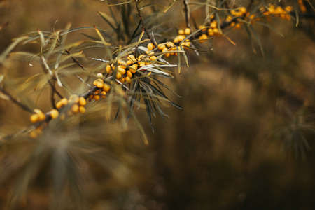 branches of wild forest sea buckthorn with ripe fruits
