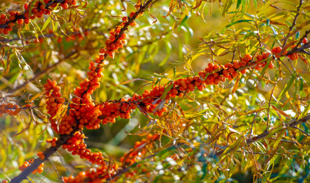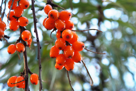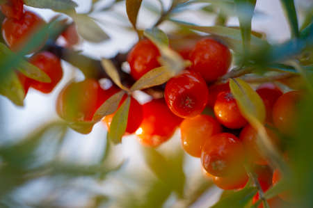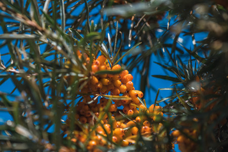 Ripe sea buckthorn berries on a branch in the sun