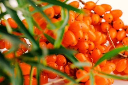 Close up branch of orange sea buckthorn berries with berries of sea buckthorn and green leaves