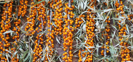 Background of sea buckthorn branches with berries. Harvest berries and protect ourselves from the flu. Berry picking season.