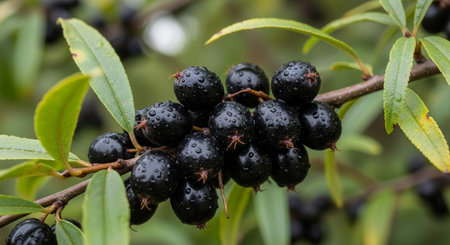 Yellow berries on a branch with green leaves and water drops after the rain