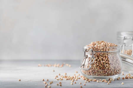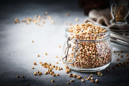 Raw green buckwheat in jar, healthy vegetarian food on gray kitchen table, copy space, selective focus
