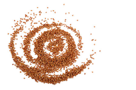 Buckwheat is randomly scattered on a white background. Top view. Copy, empty space for text.