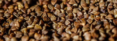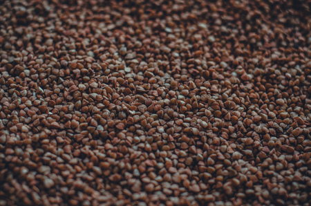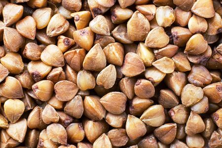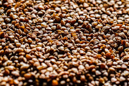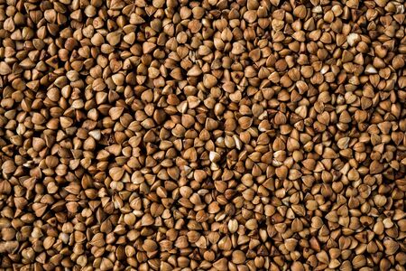 Roasted buckwheat grains background. Dry brown buckwheat groats.