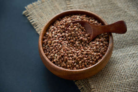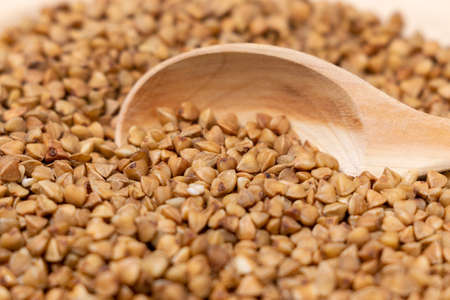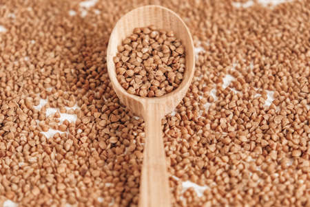 Buckwheat groats in a wooden spoon. Healthy eating concept. Vegan diet. Selective focus. for background and screen saver
