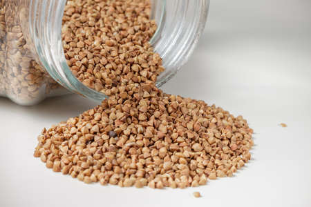 Healthy and gluten free buckwheat in a glass jar and buckwheat grains scattered on the white table, top view
