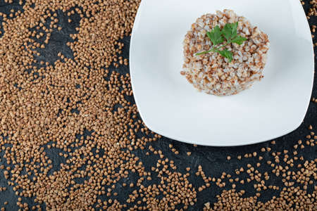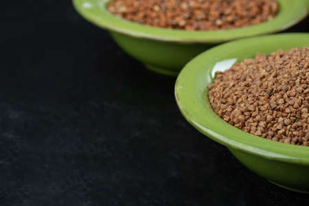 Buckwheat grain dry buckwheat. Close-up of brown buckwheat groats. Healthy food.