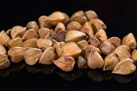 Macro collection, gluten free roasted dry boekwheat seeds close up on black background