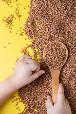 Holding Buckwheats in a wooden spoon and kids hands near it top view on a yellow background, healthy meal, zero waste
