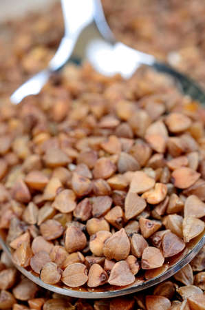 Raw buckwheat in a wooden spoon. Organic whole grains.