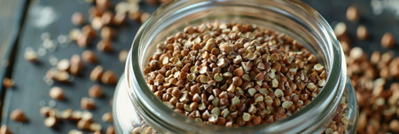 Uncooked buckwheat scattered from glass jar on the kitchen table. Selective focus