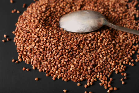 Raw buckwheat groats in a heap on a black background. Scattered buckwheat in a spoon on a dark background