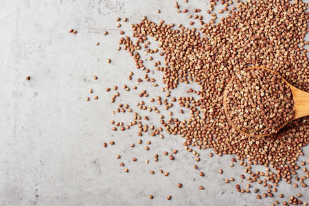 buckwheat is scattered on the table. Healthy wholesome food. Buc