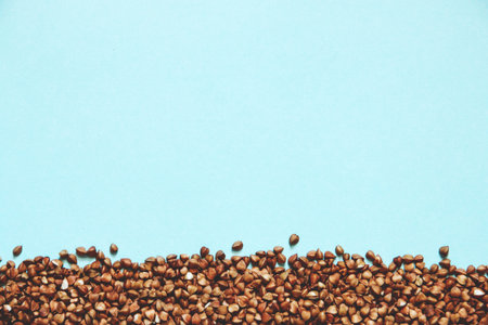 Wallpaper abstract composition of organic buckweat .Grain contains no gluten, it may be eaten by people with gluten-related disorders. Natural useful dietary product. Healthcare concept. Flat lay.Horizontal orientation.