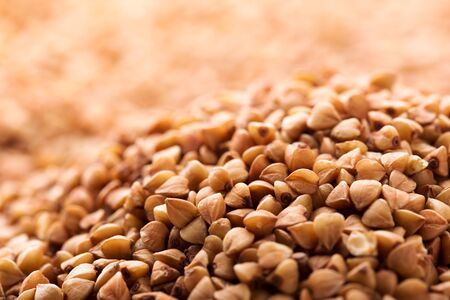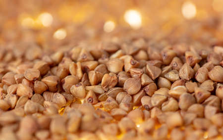 Macro photo of buckwheat groats. Many small objects close up. Healthly food