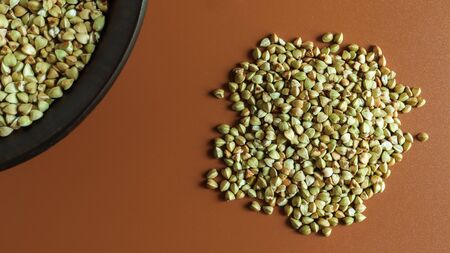 Raw green buckwheat in a brown clay plate on a brown background. Vegan organic food concept. The concept of diet, weight loss, healthy and proper nutrition. Copy space for text. Top view, flat lay.