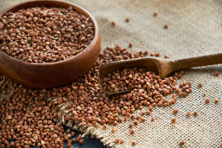 Buckwheat groats on burlap background, top view, close-up, selective focus, shallow depth of field, vertical. Buckwheat background. Useful natural cereal. Organic garnish. Premium cereal for healthy eating or dieting. Healthy food concept.