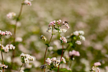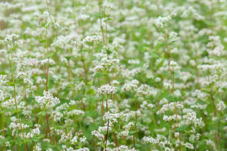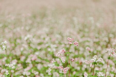 Buckwheat, Fagopyrum esculentum, Japanese buckwheat and silverhull buckwheat blooming on the field. Close-up flowers of buckwheat. soft focus